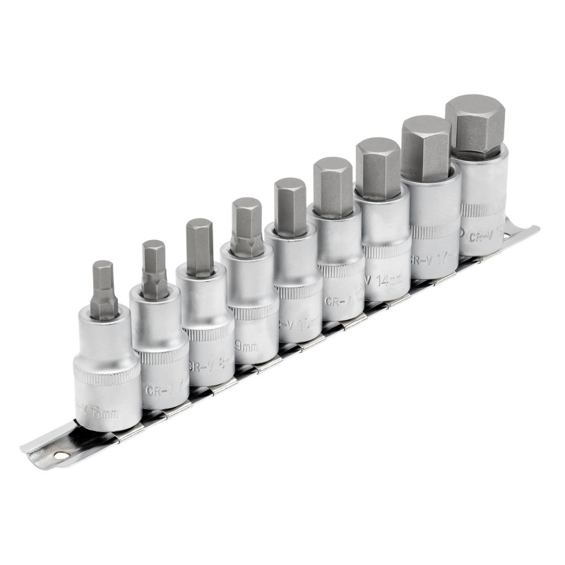 9 socket fitted with hex insert bits. All socket manufactured from hardened and tempered chrome vanadium steel with sand blasted bits of S2 silicon steel. Each socket has a knurled ring for extra grip. Supplied on a steel socket retaining rail.