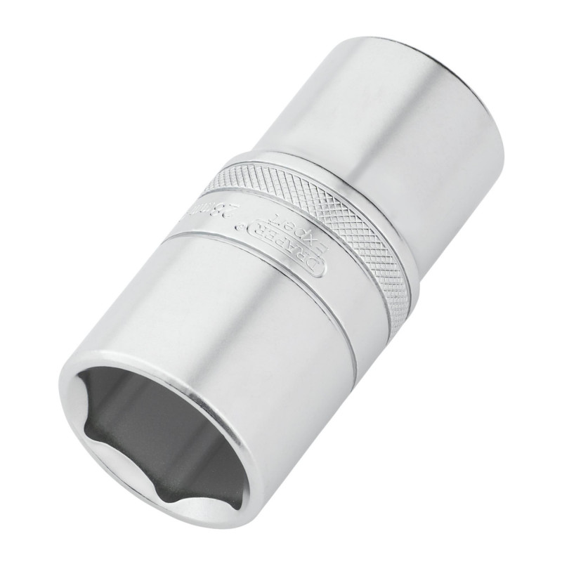 This Draper Expert Hi-TORQ® 6-point deep socket is made from hardened chrome vanadium steel and it has a chrome plated micro-satin finish for corrosion protection. Each socket includes a knurled ring for enhanced grip.