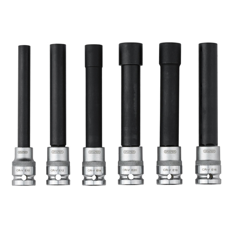 This set of extra-long E-Type sockets is designed for cylinder head maintenance. Made of chrome vanadium steel with a black phosphate finish for corrosion resistance. The set includes E10, E12, E14, E16, E18, E20. Supplied in sturdy plastic storage case.