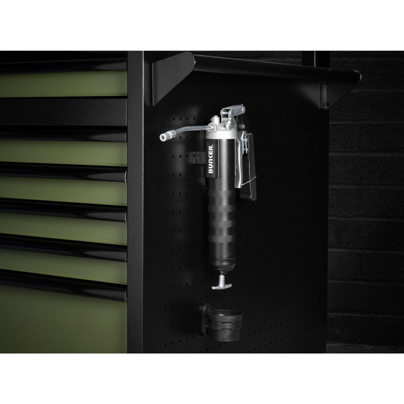 The BUNKER® magnetic grease gun holder and drip tray, secured by a robust N52 neodymium magnet and made from durable polypropylene, offers a practical solution for a cleaner, more organised workspace.