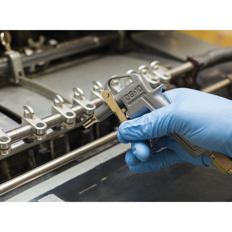 Suitable for cleaning liquid, swarf or dust during manufacture or assembly. Aluminium body with trigger and single hole nozzle. 1/4 BSP air inlet. Maximum operating pressure 30psi (2bar).