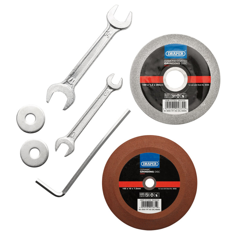 Precision 0-25° angle adjustment for consistent sharpening Suitable for 90-400mm diameter TCT saw blades Bench mounting Supplied with an additional ceramic disc for non-TCT saw blades