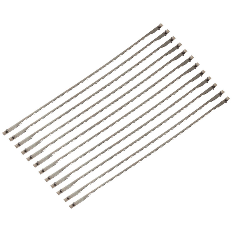 Carbon steel with hardened steel teeth with pin ends at both ends. Suitable for cutting wood, plastics, nonferrous metals and most other materials. For use with Draper Fretsaw Stock No. 89334 and 22791 and other manufacturers similar fretsaws.12 blades per display card.