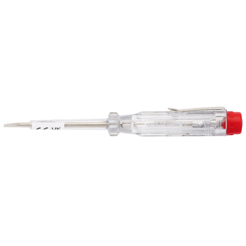 Slotted 3mm wide steel blade Insulated sheath for maximum safety Transparent handle with voltage indicator lamp Fitted with pocket clip Voltage testing range - 100-250V AC