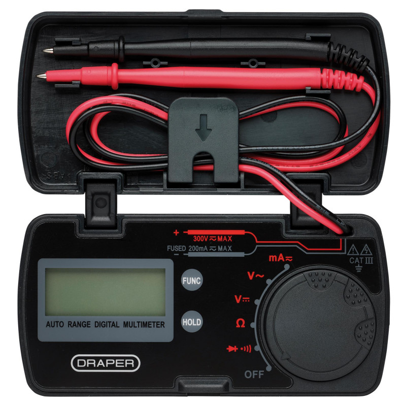 This compact pocket-sized digital multimeter accurately measures DC and AC voltage, current, resistance, diode testing, and continuity. It features an easy-to-use function selector and LCD display. Plus a built-in buzzer, polarity indication, and a data hold function for added convenience. Its lightweight design makes it ideal for use on the go, and it is supplied in a sturdy plastic storage case with test leads. Requires 2 x LR44/1.5V batteries (available separately).