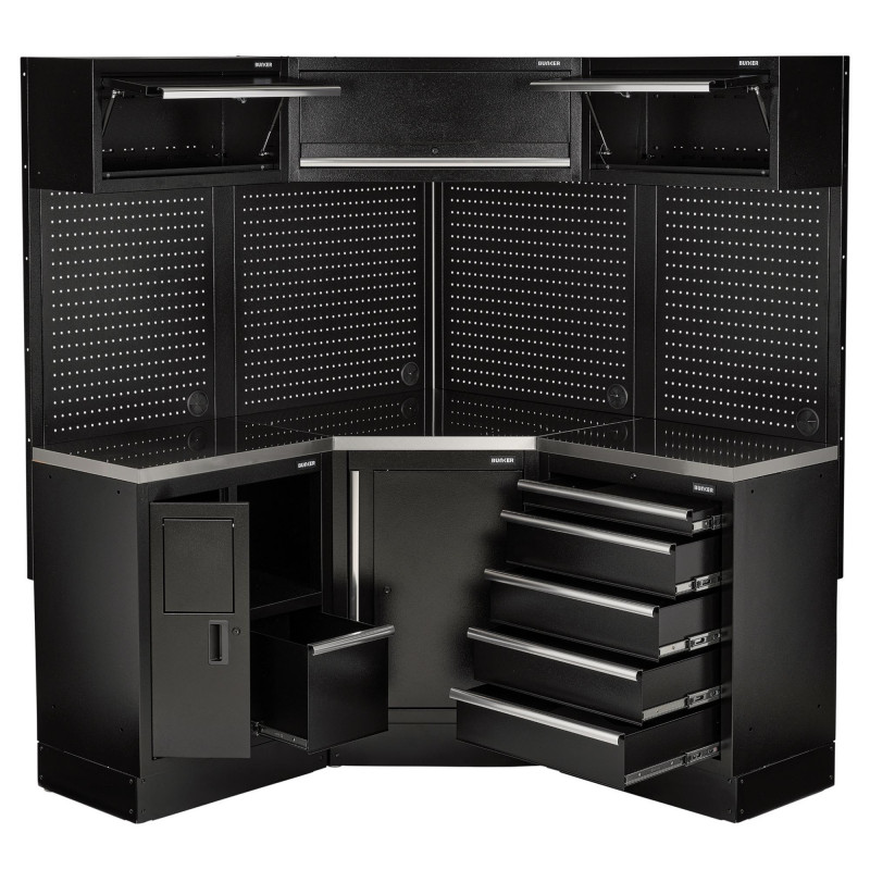 Our modular storage corner combo is made from high-quality steel, offering unparalleled performance and durability in any setting, whether it's a garage, workshop, construction site, or beyond. BUNKER is built to endure, allowing you to focus on your work while we handle tool organisation and security.