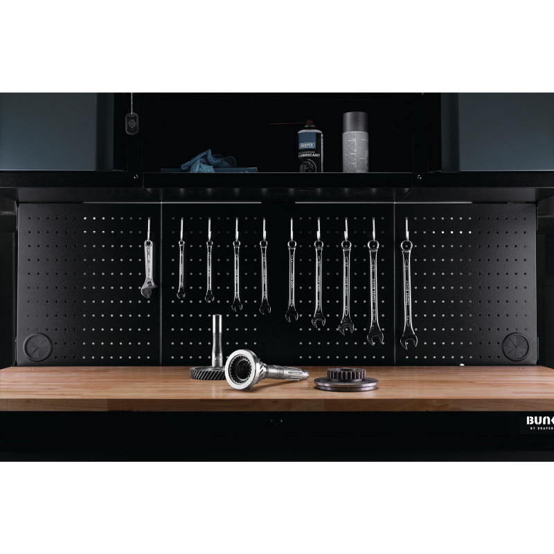 If you're looking for the perfect tool storage solution for your garage or workshop, look no further than the BUNKER® 56 roller workstation with a workbench and 10 drawers. Manufactured from high-performing steel, this ultimate storage solution offers ample space to optimise your current setup and boost workplace efficiency. Finished with a resilient matt grey textured coating, the unit is safeguarded against scratches and wear. Plus, we confidently back the quality of our products with a 10-year warranty. The 56 roller workstation unit boasts many impressive features, including ten drawers, two cupboards, two shelves, a heavy-duty worktop, a parts tray, and pegboards. The two cabinets and shelves above are connected by pegboards, allowing you to store your tools but display them for easy access. You can also keep your best and favourite tools on show. The storage tray is also a key addition for holding small parts and equipment. Every drawer features a smooth, soft-close mechanism and is lined with protective foam to ensure your tools remain safe and secure. Lastly, the 25mm thick hardwood worktop spans the entire surface of the unit, offering extra space for you to complete your daily tasks. Order your BUNKER® storage solution online through our trusted network of stockists.