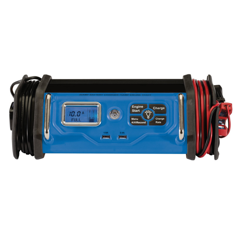 Easy-to-use microprocessor-controlled 12V battery charger that delivers a fully automatic smart charge with its 70 Amp engine start function. Mode selection control panel with charge button and ability to select the charge rate: 2A, 5A, 10A, 20A and 30A. There is an LCD screen with easy to read icons. Rugged design fitted with on-board cord storage and clamp holder. There is also a LED worklight and two USB ports for charging mobile devices. Battery reconditioning (desulphation) mode and built-in LED Light.