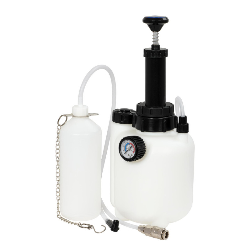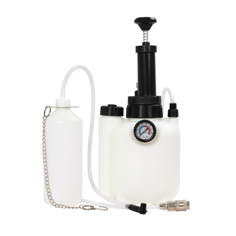 Pump-action manual bleeder Ideal for one-person operation on vehicles unable to be bled using suction Reservoir holds 3L of hydraulic fluid 1L waste oil bottle Easy to read pressure gauge