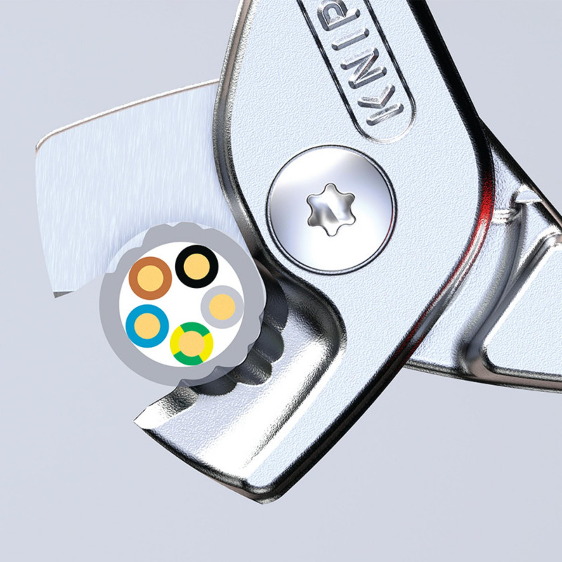 95 12 160 SB KNIPEX StepCut® Small, light, strong: comfortable cutting without crushing and just 160 mm in size. Noticeably less effort: the gradations cut wires one after the other; cutting is up to 40% easier than with standard cable shears of the same length!. Ergonomic handle design: optimal cutting feel even for larger cable diameters. Cuts multi-core stranded copper and aluminium cables up to Ø 15 mm (50 mm²). Cuts solid copper and aluminium cables up to 5 x 4 mm². Cuts without crushing. Bolted joint: precise, effortless, durable. Pinch guard prevents operators' fingers being pinched. Not suitable for steel wire and hard drawn copper conductors. Cutting edges additionally induction-hardened, cutting edge hardness approx. 56 HRC. - Cutting capacity copper cable, multiple-stranded: 50mm²- Cutting capacity copper cable, multiple-stranded: Ø 15mm- AWG: 1?/ 0