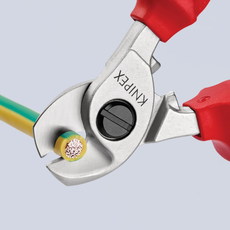 95 16 165 SB Cable Shears For cutting copper and aluminium single conductors as well as multiple stranded cables. Clean and smooth cut without crushing and deformation. Not suitable for steel wire and hard drawn copper conductors. Precision-ground, hardened blades. Easy cutting with one-hand operation. With guard. Adjustable bolted joint, self-retaining screw. self-service card/blister. - Cutting capacity copper cable, multiple-stranded: 50mm²- Cutting capacity copper cable, multiple-stranded: Ø 15mm- AWG: 1?/ 0- VDE tested: yes