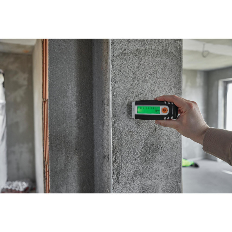 The material moisture measuring device determines the precise moisture content in per cent of many types of wood and construction materials, perfect for quick checks. Wood moisture measurements are carried out in wood group A or B mode. The index mode allows moisture detection measuring points to be compared. The user can check the accuracy of the device at any time by taking a reference measurement through the protective cap. Easy-to-read display for convenient use. The housing is made from a large proportion of recycled material and makes a valuable contribution to sustainability. Supplied with battery.