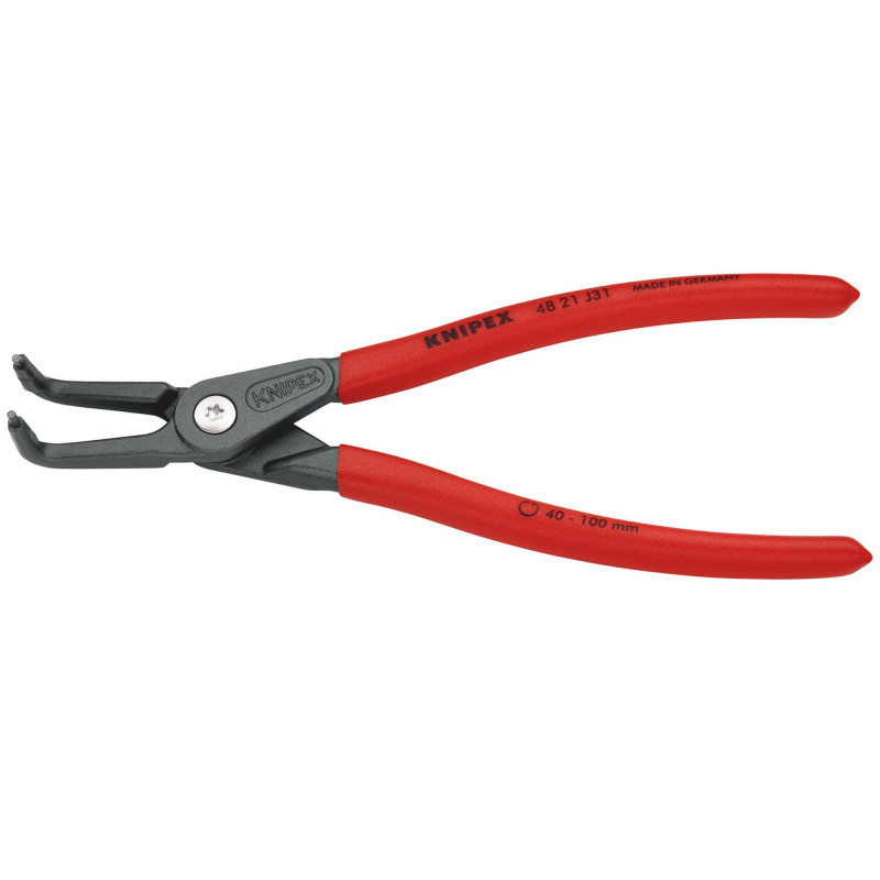 48 21 J31 SB Precision Circlip Pliers heavy duty in continuous operation: up to 10 times longer service life compared to turned tips. With inserted tips for reliable work. Large contact faces on the tips: no distortion of circlips, easy fitting. Bolted joint: precise, zero backlash operation of pliers. Non-slip plastic coating on the handles. DIN 5256 D; 90° angled jaws. - Size of bore: Ø 40?–?100mm- Tips (diameter): Ø 2.3mm