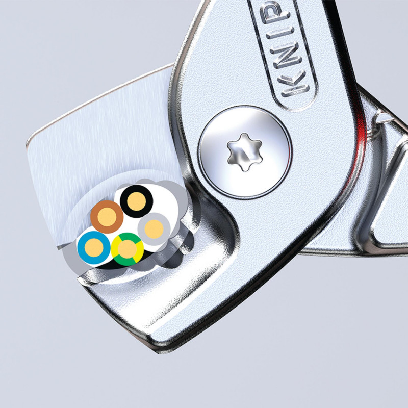 95 11 160 SB KNIPEX StepCut® Small, light, strong: comfortable cutting without crushing and just 160 mm in size. Noticeably less effort: the gradations cut wires one after the other; cutting is up to 40% easier than with standard cable shears of the same length!. Ergonomic handle design: optimal cutting feel even for larger cable diameters. Cuts multi-core stranded copper and aluminium cables up to Ø 15 mm (50 mm²). Cuts solid copper and aluminium cables up to 5 x 4 mm². Cuts without crushing. Bolted joint: precise, effortless, durable. Pinch guard prevents operators' fingers being pinched. Not suitable for steel wire and hard drawn copper conductors. Cutting edges additionally induction-hardened, cutting edge hardness approx. 56 HRC. - Cutting capacity copper cable, multiple-stranded: 50mm²- Cutting capacity copper cable, multiple-stranded: Ø 15mm- AWG: 1?/ 0