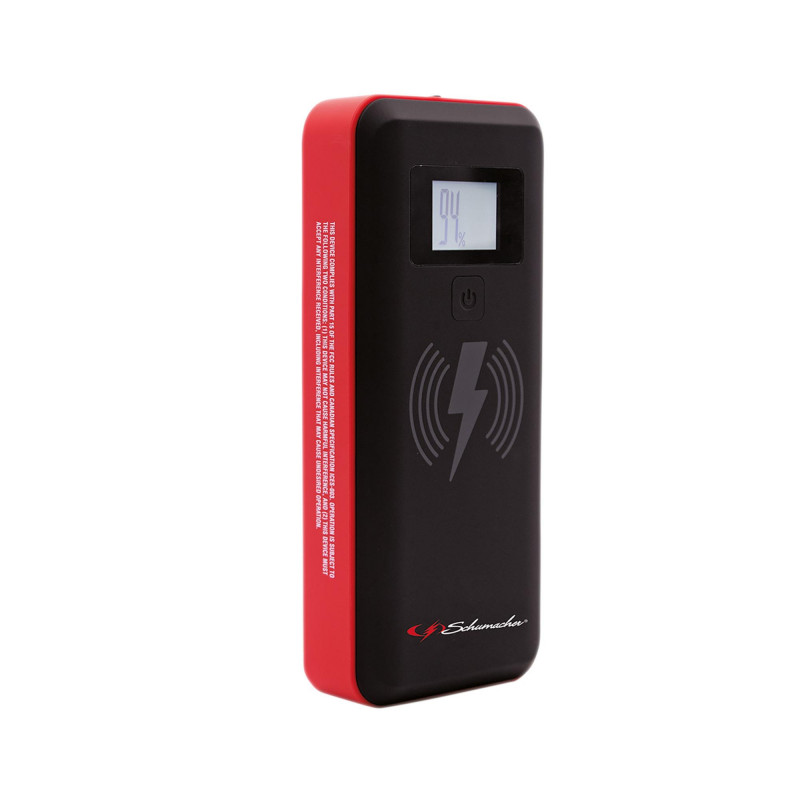 This compact Schumacher lithium jump starter and power bank is designed for on-the-go charging. Its advanced 16V 4-cell lithium technology provides superior starting performance for jump-starting 7L petrol and 5L diesel engines with 12V dead batteries. The Pre-Boost technology pre-charges deeply discharged batteries, and the Pre-heat mode warms the battery for optimal starting in low temperatures. The built-in flashlight offers flashing and SOS modes for emergency use. There is an easy to read LCD screen. In addition to jump-starting cars, the unit functions as a powerful battery pack offering wireless charging for Qi compatible devices and a USB-C output for charging mobile devices. For safety, the unit protects against reverse polarity, short circuit, low voltage, high temperature and reverse charging. Includes a smart cable with battery clamps, USB-C charging cable and storage case.