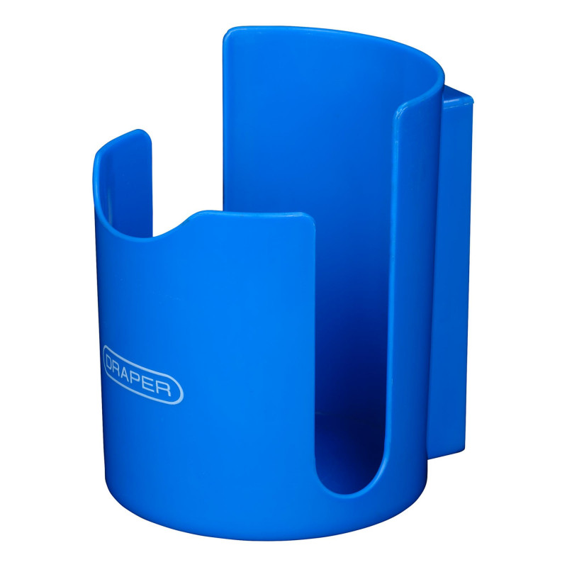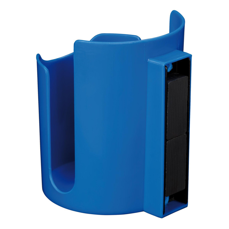 Magnetic cup holder, suitable for use with cups, cans, water bottles and aerosol cans. Made from ABS plastic, fitted with a powerful magnet for attaching to tool cabinets, metal storage units or any other ferrous metal surface. Size - 90mm diameter x 120mm.