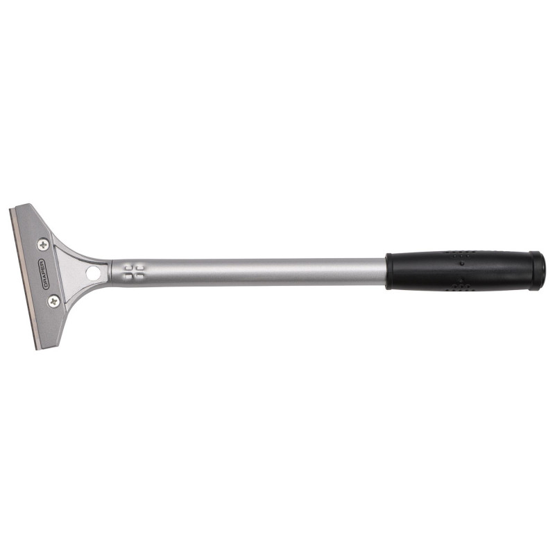 Long handled scraper with angled head for improved leverage Robust steel shaft and aluminium alloy head 100mm wide two-sided reversible steel blade Spare blades available - Draper Stock No. 07133