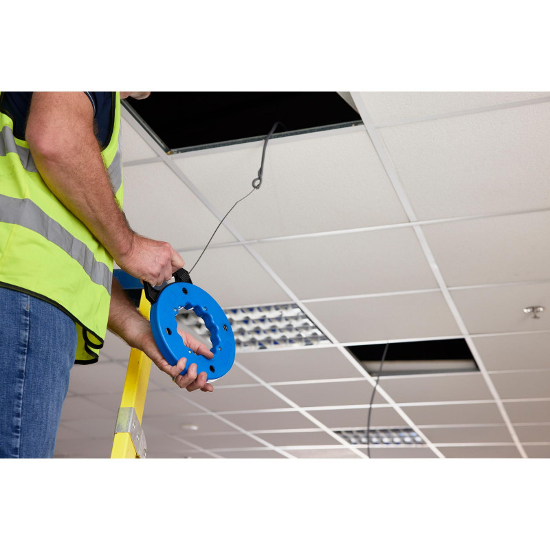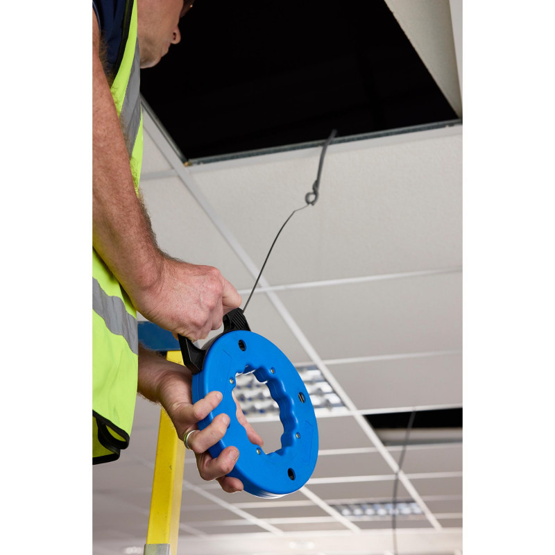 Designed for drawing electrical wiring through conduits. Manufactured from oil tempered wire with blackened finish. Housed in convenient rotating plastic storage case with handle. Brake trigger mechanism in handle. The hooked end avoids snagging once the wiring has been attached.
