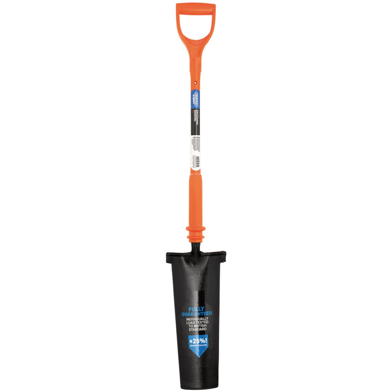 Fully insulated drainage shovel Designed for working on or near live cable and wires Individually tested to 10,000 volts, guaranteeing safe working on 1,000V Manufactured with an epoxy fibreglass core and attached to a reinforced collar and fully enclosed insulated shaft. Supplied with a certificate of conformity, which correlates with a unique traceability number embossed on the shaft