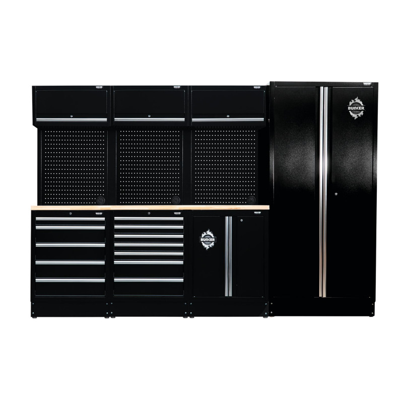 All BUNKER® products come with a 12-month warranty, extended to 10 years upon registration Soft close drawers lined with EVA foam Lift-up cabinet doors operated by smooth running gas struts Pegboards for keeping tools displayed and accessible Stylish hardwood worktop Measures W 2,955 x H 2,000 x D 463mm