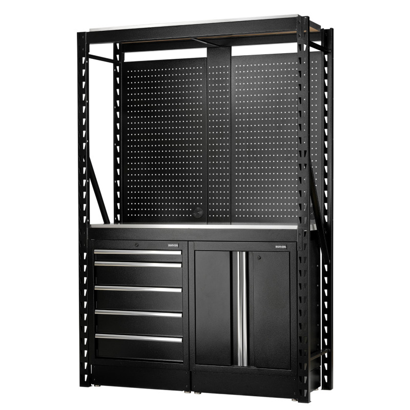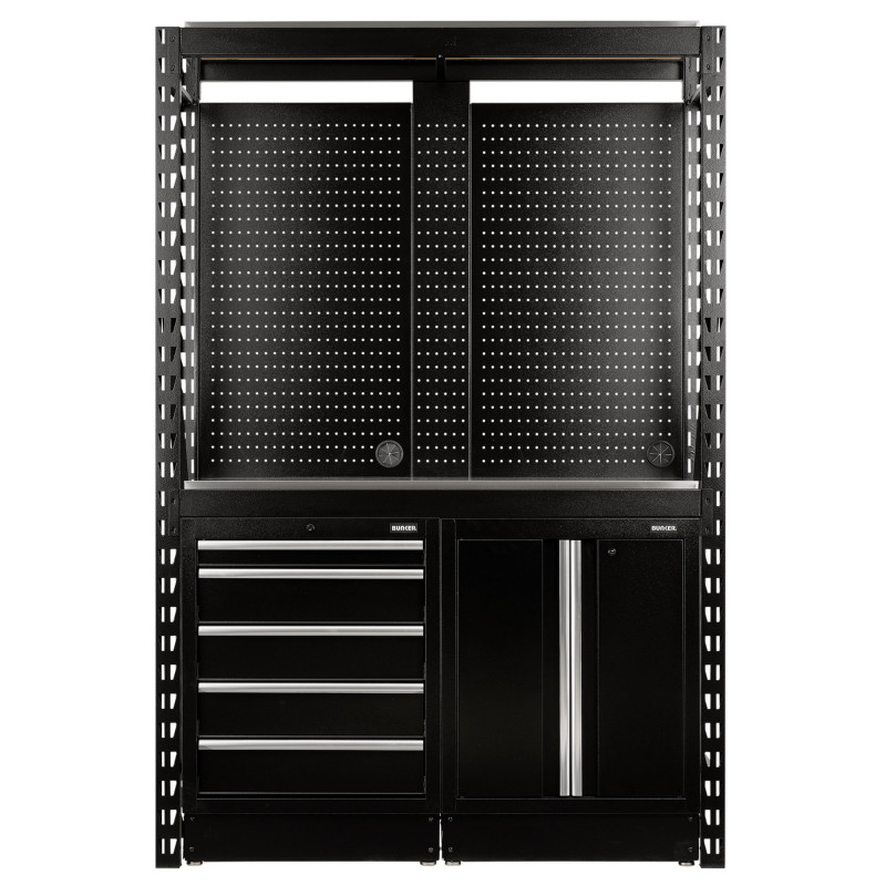 Take your garage, workshop or commercial space to the next level with the BUNKER® 2-tier racking modular storage combo. This 15-piece set-up includes everything you need to start optimising your space to its fullest potential. The 2-tier racking system includes two-floor cabinets: a five-drawer unit and a two-door unit with aluminium handles and integral locks for security, each supplied with two keys. The drawer unit features smooth, soft-close drawers lined with foam to protect tools, while the two-door unit offers excellent storage with an adjustable shelf inside. The premium-quality stainless steel shelving adds the perfect finishing touch to this storage solution.  Each pegboard panel features a pre-cut hole for power cable access. To make assembly easier, it is recommended that two persons aid one another in assembly. Measures 1500mm.