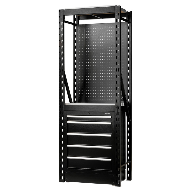 The BUNKER® 750mm 2-tier racking system is a 13-piece space-saving solution for all your tool storage needs. This modular storage combo features stainless steel shelving, pegboards and floor cabinets for additional storage space. Constructed from heavy-duty steel with a protective powder-coated finish for durability. The floor cabinet has smooth, soft-close drawers lined with foam, aluminium handles and an integral lock for security, supplied with two keys.