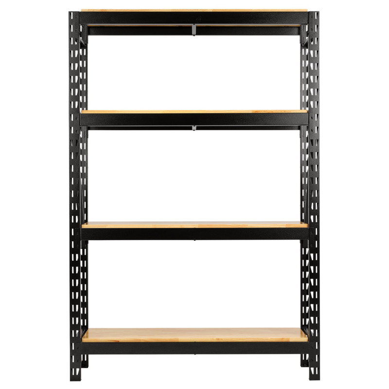 Discover the modular 4-tier racking system by BUNKER®. It contains 18 pieces with premium hardwood shelving, allowing you to customise and optimise your storage space to its full potential. Its heavy-duty steel construction boasts an industrial powder-coated finish, safeguarding against scratches, wear, and corrosion for long-lasting durability.