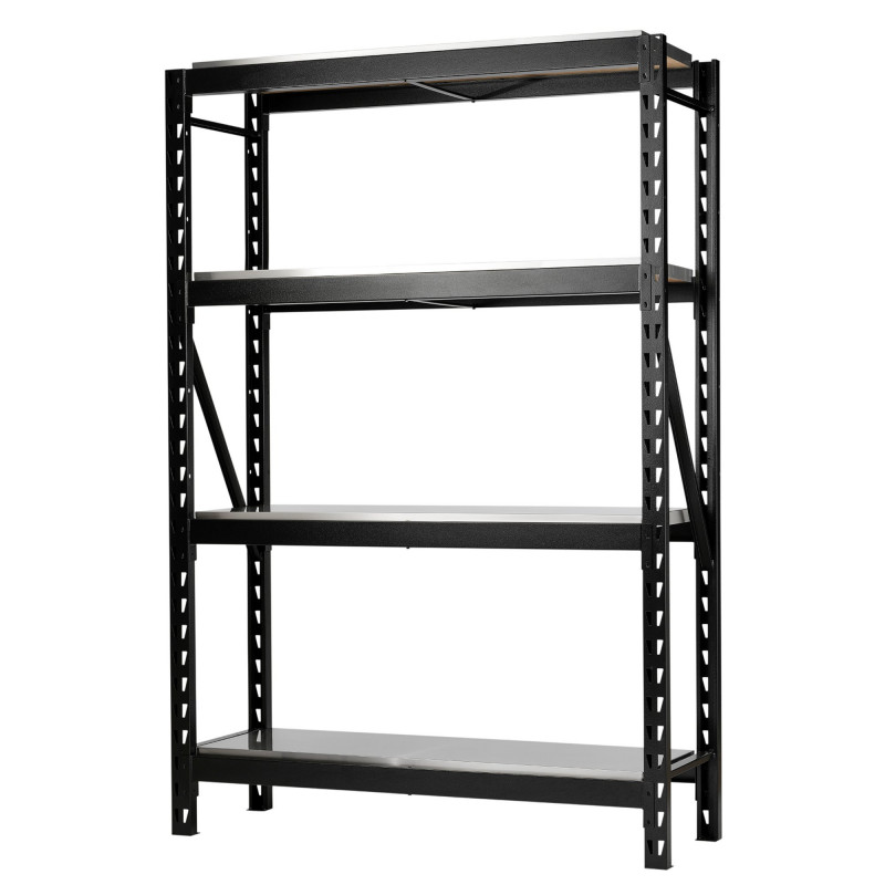 Discover the modular 4-tier racking system by BUNKER®. It contains 18 pieces with premium stainless steel shelving, allowing you to customise and optimise your storage space to its full potential. Its heavy-duty steel construction boasts an industrial powder-coated finish, safeguarding against scratches, wear, and corrosion for long-lasting durability.