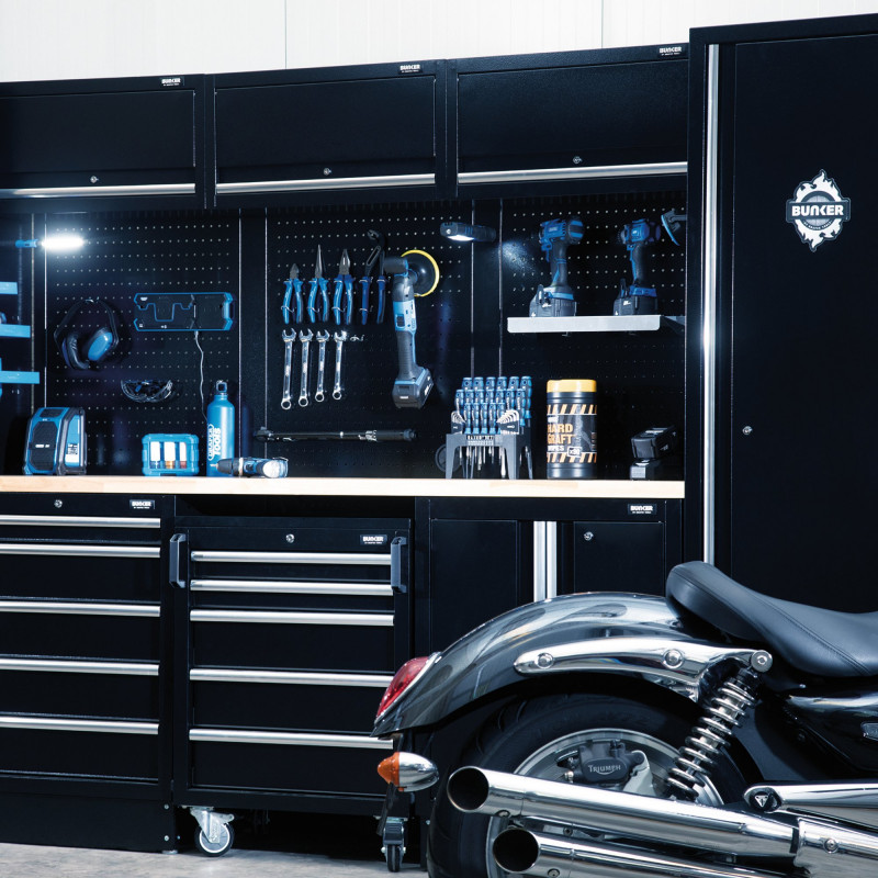 All BUNKER® products come with a 12-month warranty, extended to 10 years upon registration This includes 1 mobile cabinet, 2 floor cabinets, 3 wall cabinets, 2 tall floor cabinets, 1 hardwood worktop, 3 back panels/pegboards, 2 side wall single brackets, and 2 side wall double brackets Soft-close foam-lined drawers Lift-up doors operated by quiet gas struts Free magnet displaying the BUNKER® logo Measures W 3240 x H 2000 x D 463mm
