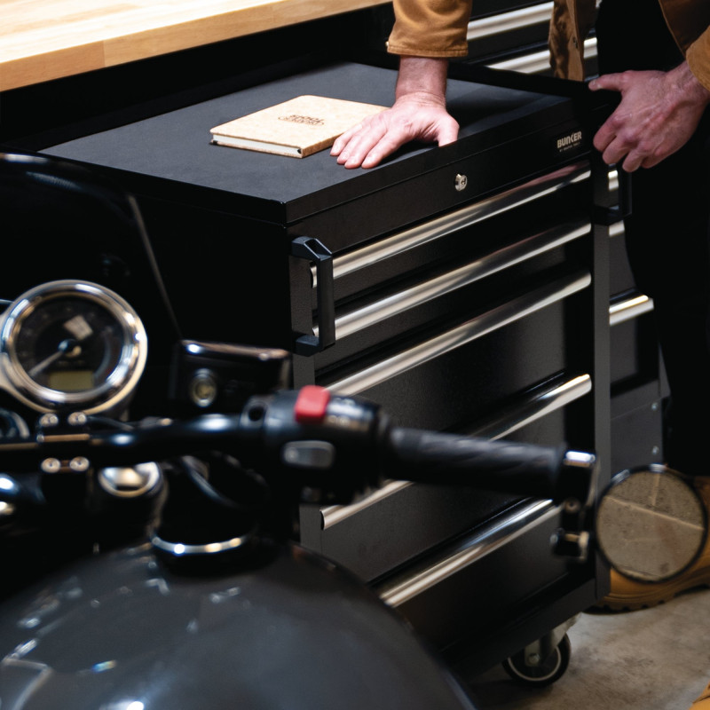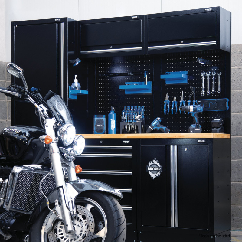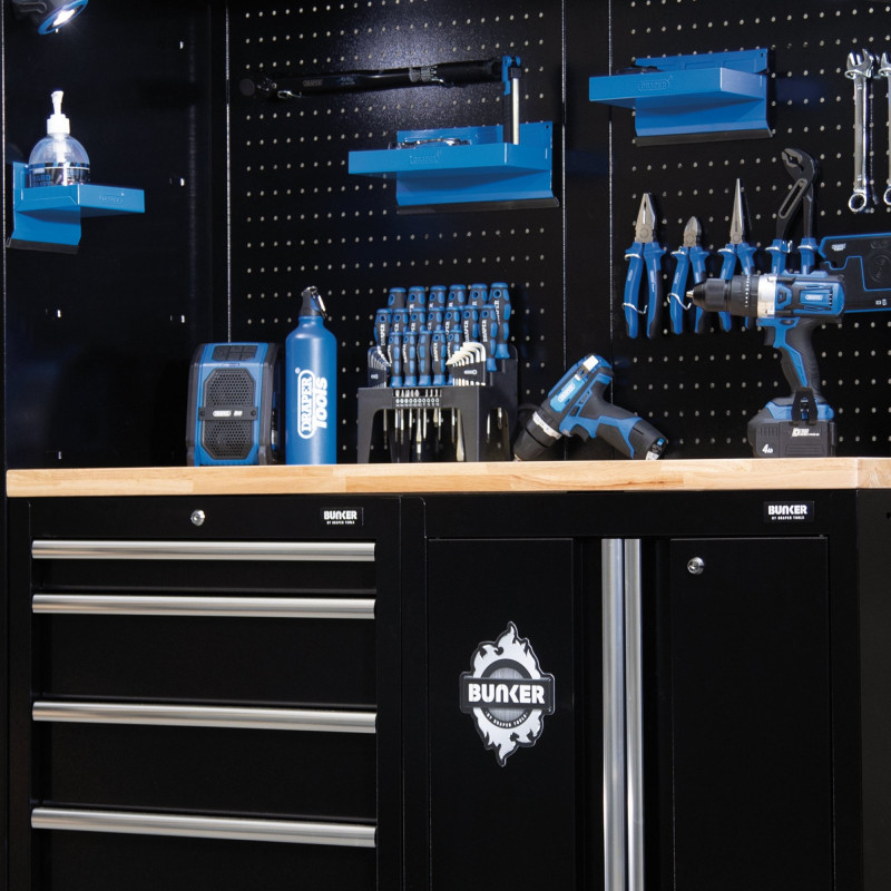 The BUNKER® 1960mm 11-piece modular storage combo with a hardwood worktop is engineered to provide a durable, dynamic, and versatile workspace for all your tasks and projects. It offers a range of features designed to optimise the full potential of your workspace. Each drawer boasts a soft-close mechanism and foam lining to protect your tools, enhanced by robust aluminium handles and a matt black textured finish. Our cabinets include adjustable feet for perfect positioning and lift-up doors operated by quiet gas struts. The back panels included also serve a dual purpose, functioning as pegboards to store and display your tools proudly. They also feature pre-cut holes for easy power supply access. Additionally, each combo comes with a complimentary magnet that displays the distinctive BUNKER® logo. Maximise your workspace and enhance your storage capabilities with the innovative BUNKER® combo. Explore our wide range of online stockists and place your order today. Important Information: Bunker Hardwood Worktops and Shelves Bunker worktops and shelves are made from hardwood and are sealed with a clear lacquer. Wood is a natural material, and no two tops will be identical in appearance. There will be a natural variation in colour, grain and will not be an exact match to any representation in brochures or on websites. Wooden tops are not suitable for use in damp environments and require maintenance to retain and preserve their appearance.