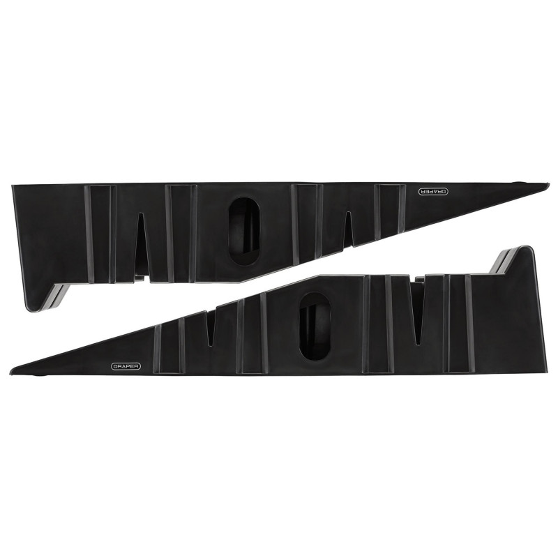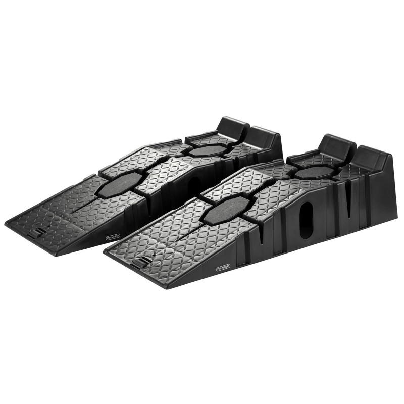 These plastic car ramps have a non-skid thread design to prevent slipping during in use. Additionally, rubber pads mounted on the bottom of the ramps enhance their stability. Each ramp has a wide frame and is suitable for most cars, as well as some light commercial vehicles, with a tyre tread of 240mm or less.