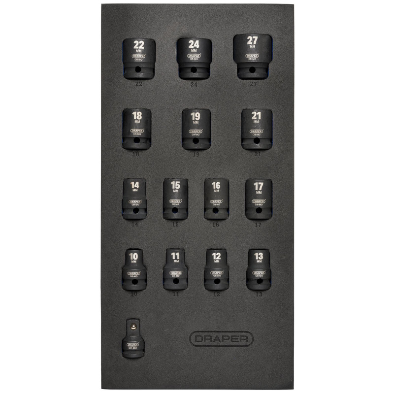 These Draper HI-TORQ® 6-point impact sockets are forged from hardened chrome molybdenum. Black phosphate finish for corrosion protection. Includes sizes 10, 11, 12, 13, 14, 15, 16, 17, 18, 19, 21, 22, 24, 27mm and a 3/8 (F) x 1/2 (M) socket converter. For use with electric or pneumatic impact wrenches with a 1/2 drive. Supplied inside an EVA drawer insert tray, 168 x 270 x 30mm. It is suitable for use in Draper and Draper Expert tool chests and other manufacturer's similar products.
