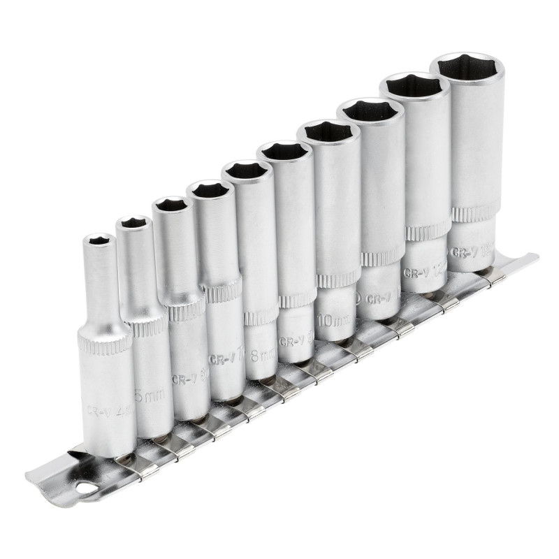 10 Sockets Manufactured from chrome vanadium steel, hardened, tempered and satin chrome plated Each socket has a knurled ring for extra grip