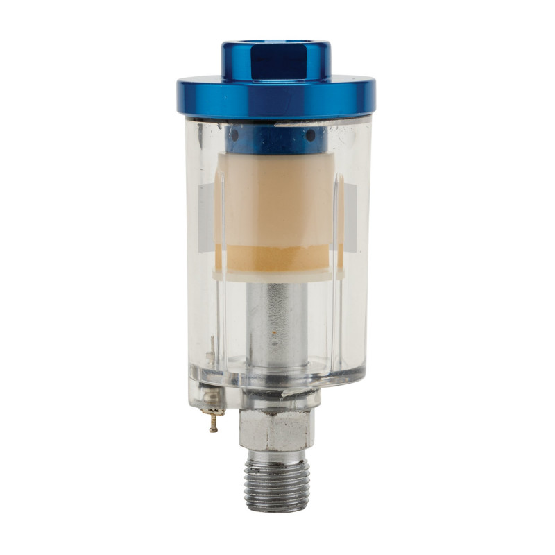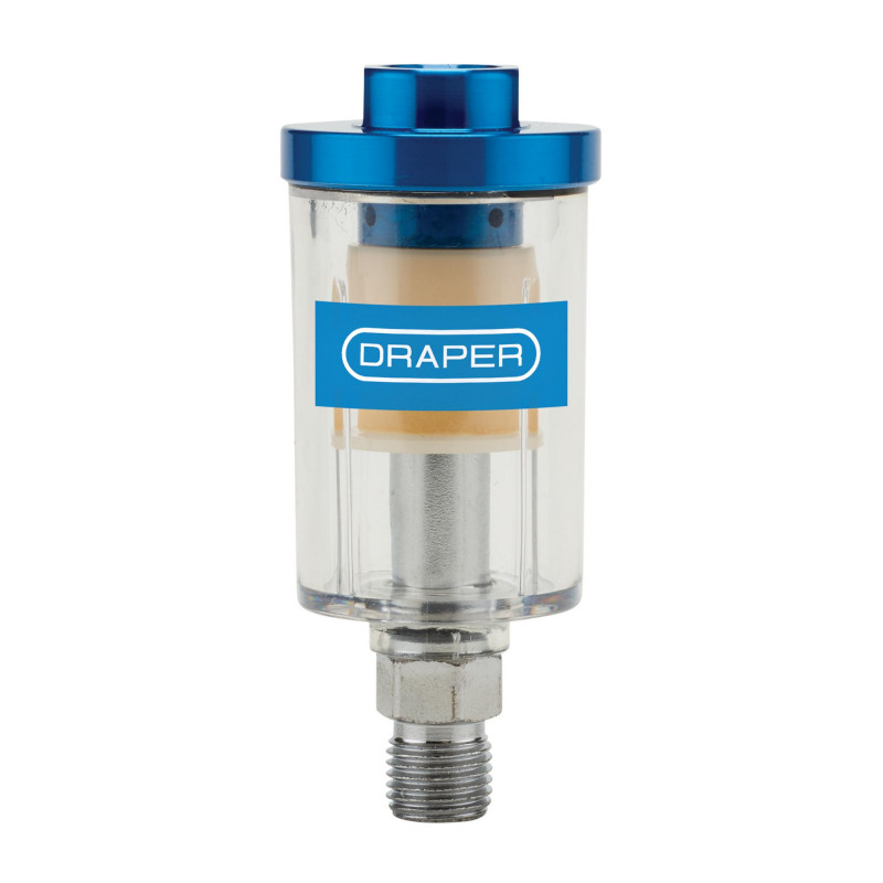 Fitted with a standard 1/4 BSP thread Inline water trap and filter is for use with spray guns Compact, lightweight and easy to install and maintain Fits the airline or directly onto a spray gun to prevent water contaminating paintwork