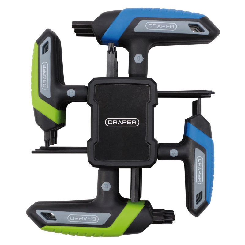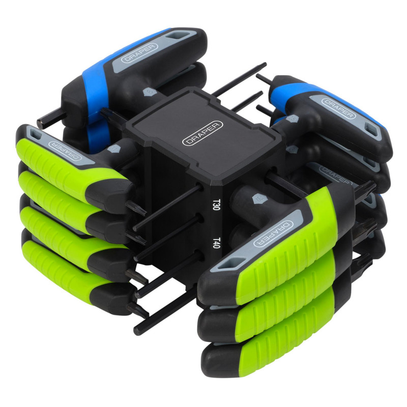 This stylish T-handle hex key set features a variety of both metric and TX-STAR® blades, all crafted from chrome vanadium steel. Each key has both a long shank and a short shank, allowing for easier access to deep and shallow screws. The colour-coded T-handle is ergonomically designed for comfort and provides additional torque during use. The set is conveniently stored in a space-saving four-sided box, with TX-STAR® and metric keys organised inside.