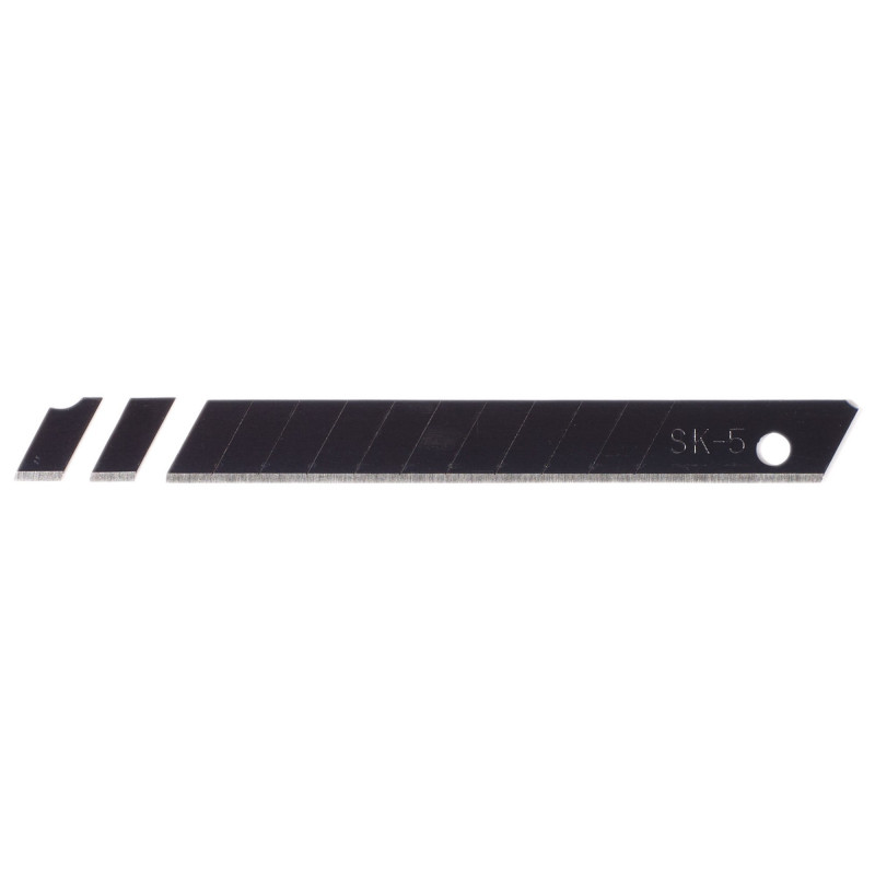 This pack contains 10 easy-to-use snap-off blades, each measuring 9mm in length. Made from SK5 steel with a blackened coating to reduce friction, these blades have a thickness of 0.4mm. Supplied in a shatter-resistant plastic storage case.
