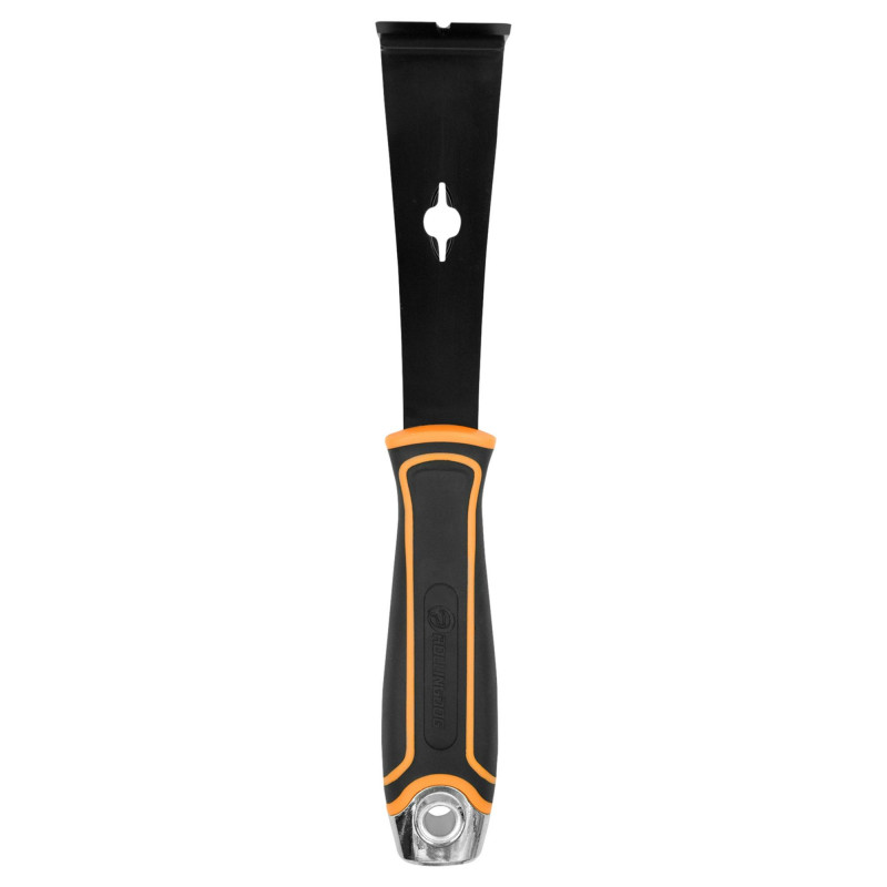 This pry bar from ROLLINGDOG is made from 420 stainless steel and has a protective coating for durability. It includes a nail pulling slot in the end and centre of the bar, as well as a chiseled angled head for better leverage. There is a soft grip handle for comfortable use. For tasks that require extra force, there is a metal hammer cap at the end. Additionally, it includes a hang hole for convenient storage.