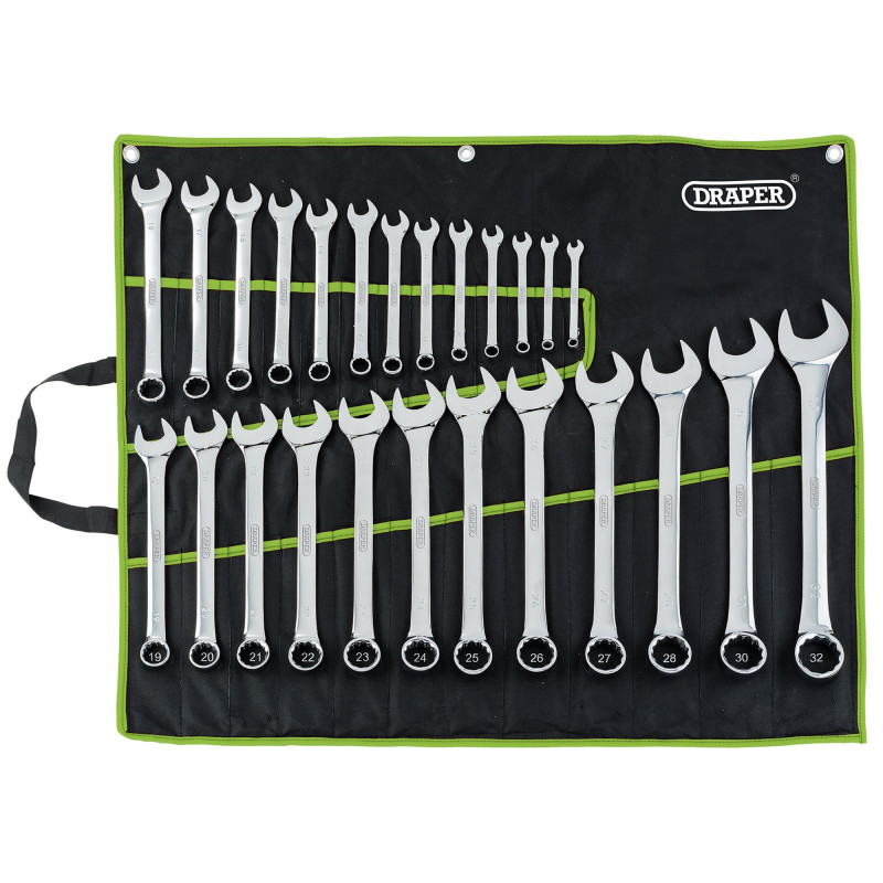 Combination Spanner Set offering 25 different sized ends ranging from 6-32mm. All forged from chrome vanadium steel that has been hardened, tempered and fully polish chrome plated for added corrosion protection.